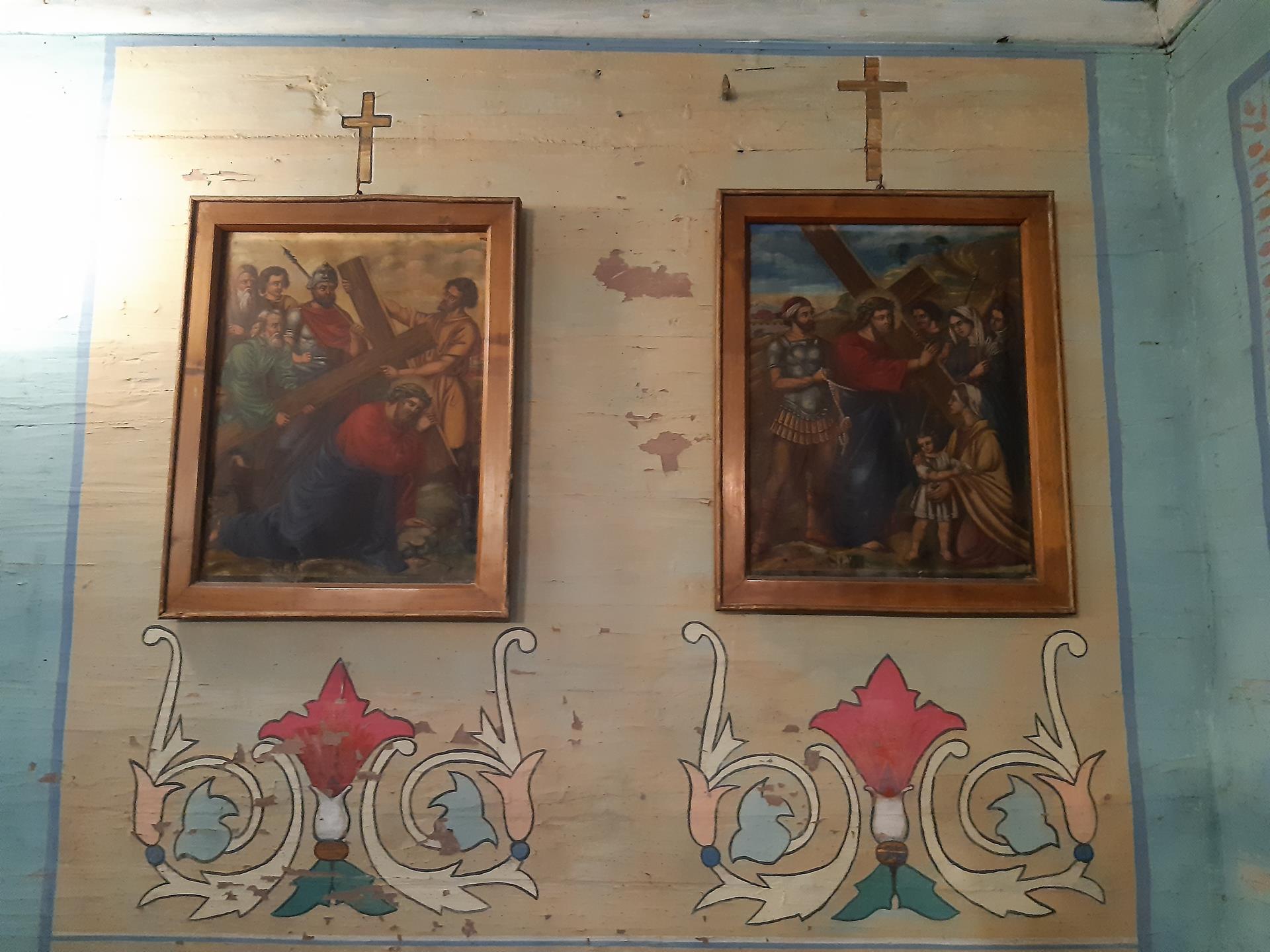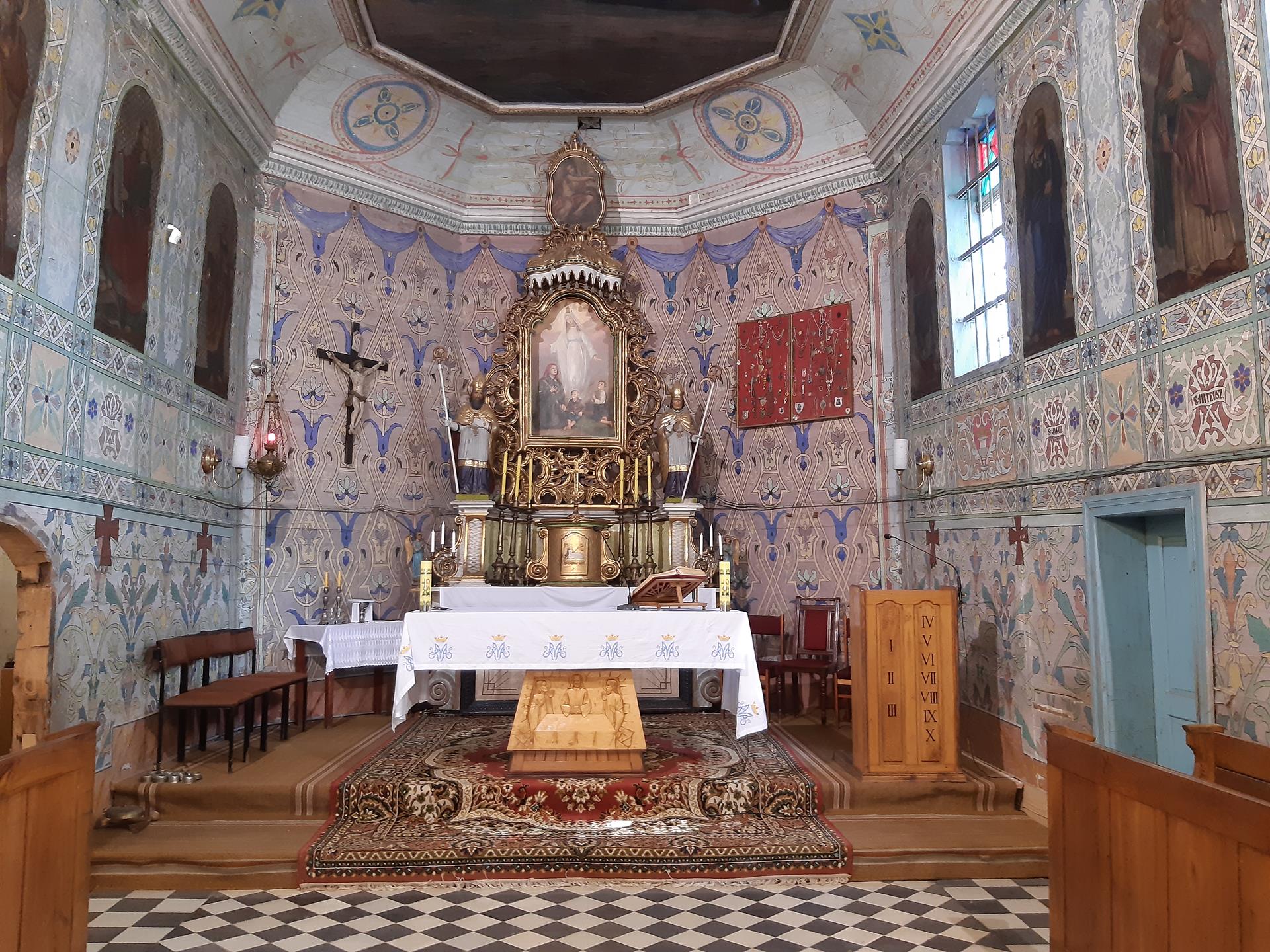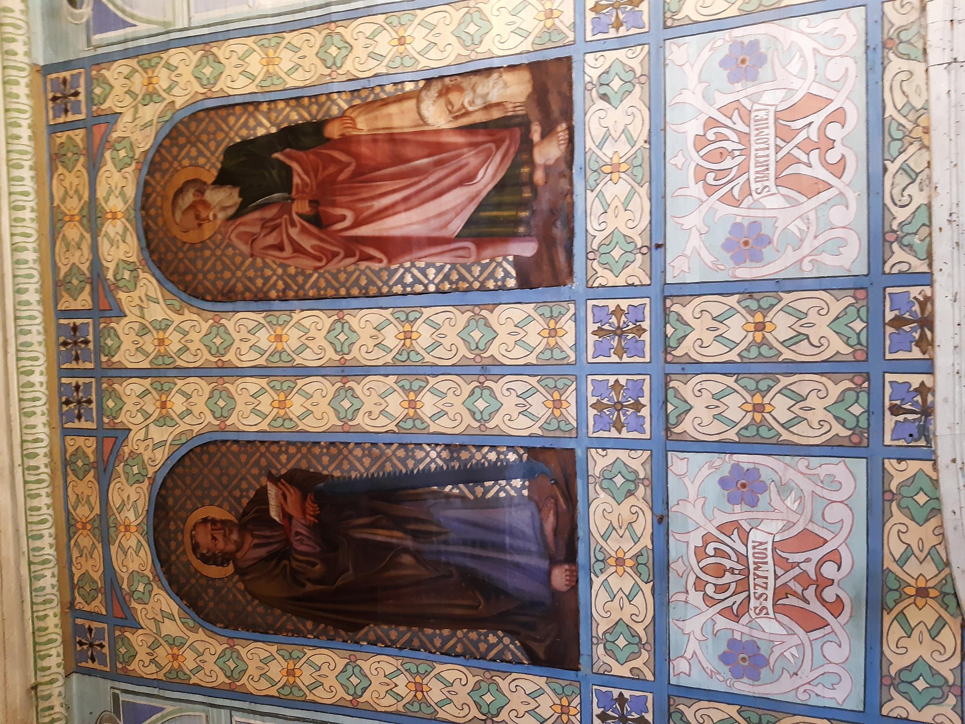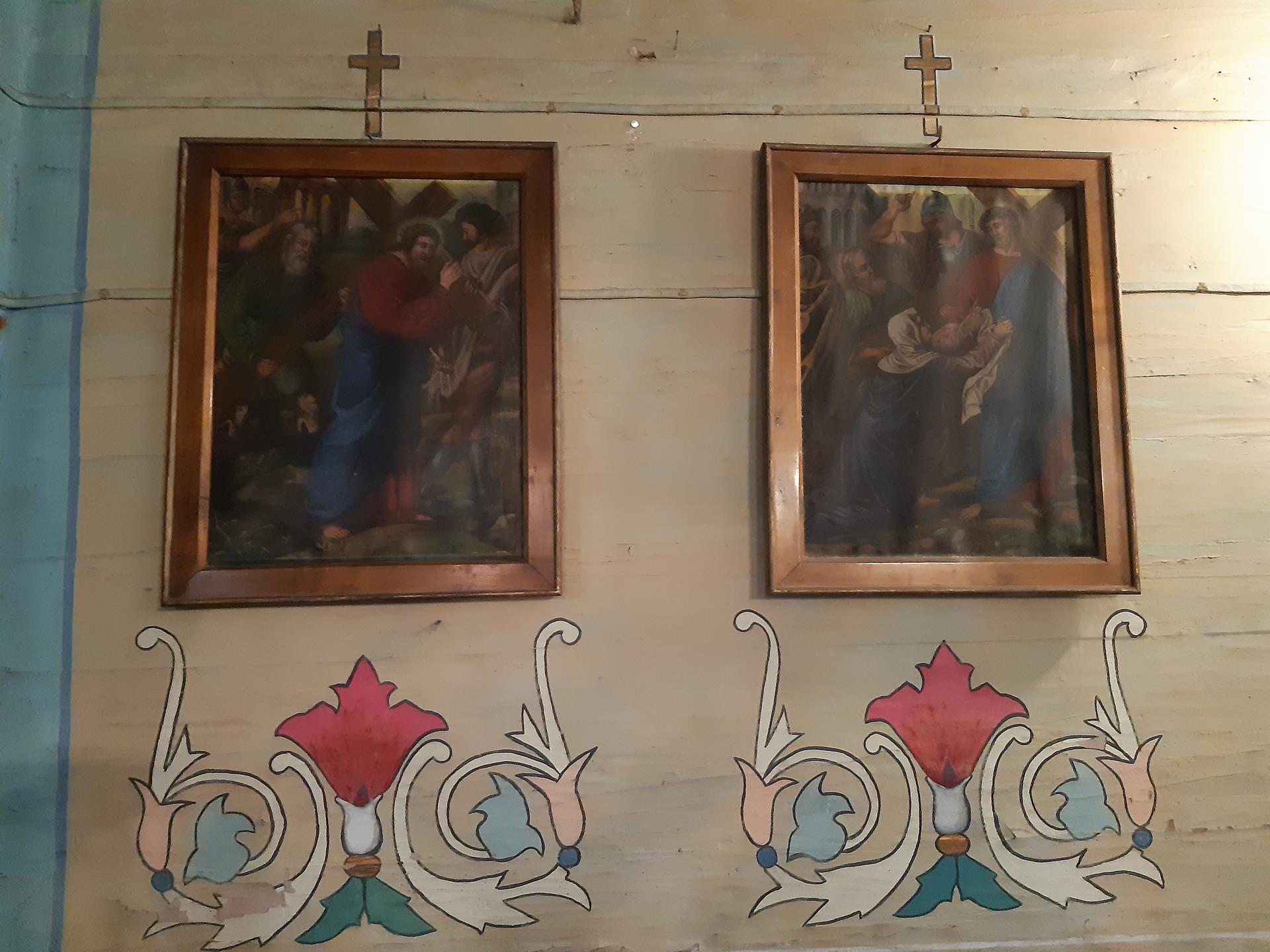 Ściany w kościele pomalowane są kolorowo, o przewadze jasnej zieleni, zdobione roślinnymi ornamentami. Kolorystyka polichromii oraz zdobienia posiadają naleciałości wschodniego stylu. Na ścianach widnieją olejne portrety, wykonane na płótnie, przedstawiające naturalnej wielkości dwunastu Apostołów. W prezbiterium od strony ołtarza, na ścianie północnej znajdują się obrazy świętych: Piotra, Jana, Filipa, Jakuba Młodszego, oraz symetrycznie na ścianie południowej świętych: Macieja, Jakuba Starszego, Mateusza i Andrzeja. Na ścianie północnej w nawie zostały umieszczone wizerunki świętych: Bartłomieja i Szymona, oraz symetrycznie na ścianie południowej nawy świętych: Tomasza i Tadeusza. Obrazy malował w 1883 r. malarz Stankiewicz z Oświęcimia, uczeń Jana Matejki. Było to drugie malowanie wnętrza kościoła. Pierwszego dokonano przed konsekracją świątyni, bo w 1777 r. Podczas prac konserwatorskich udało się odnaleźć i zabezpieczyć fragmenty oryginalnych malowideł naściennych, zdobiących prezbiterium. Można je zobaczyć za ołtarzem głównym oraz pod poziomem drewnianej podłogi w prezbiterium.