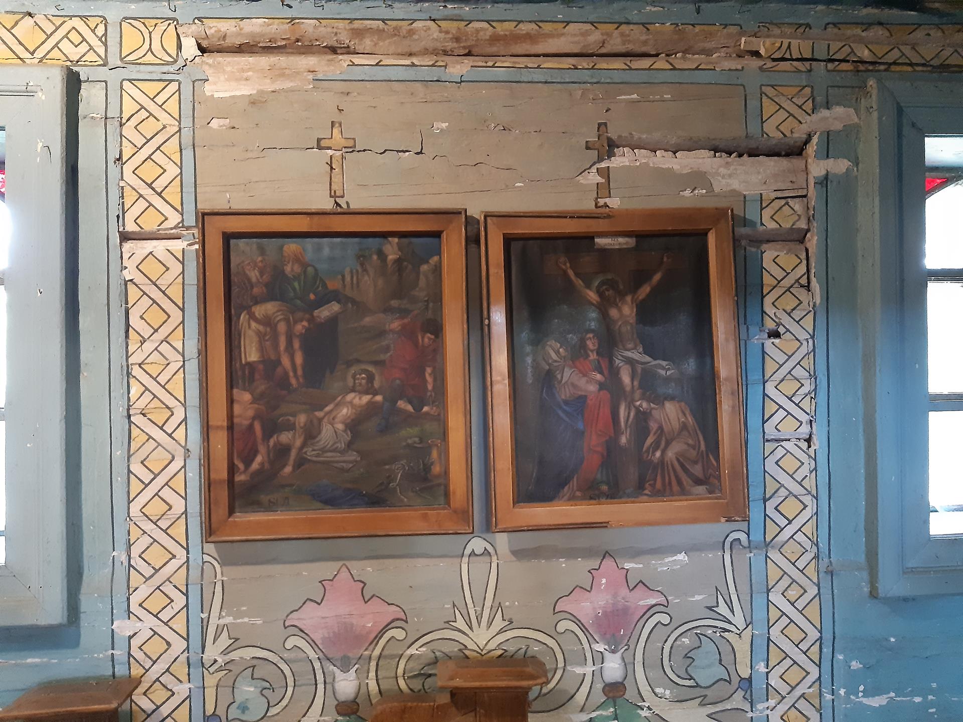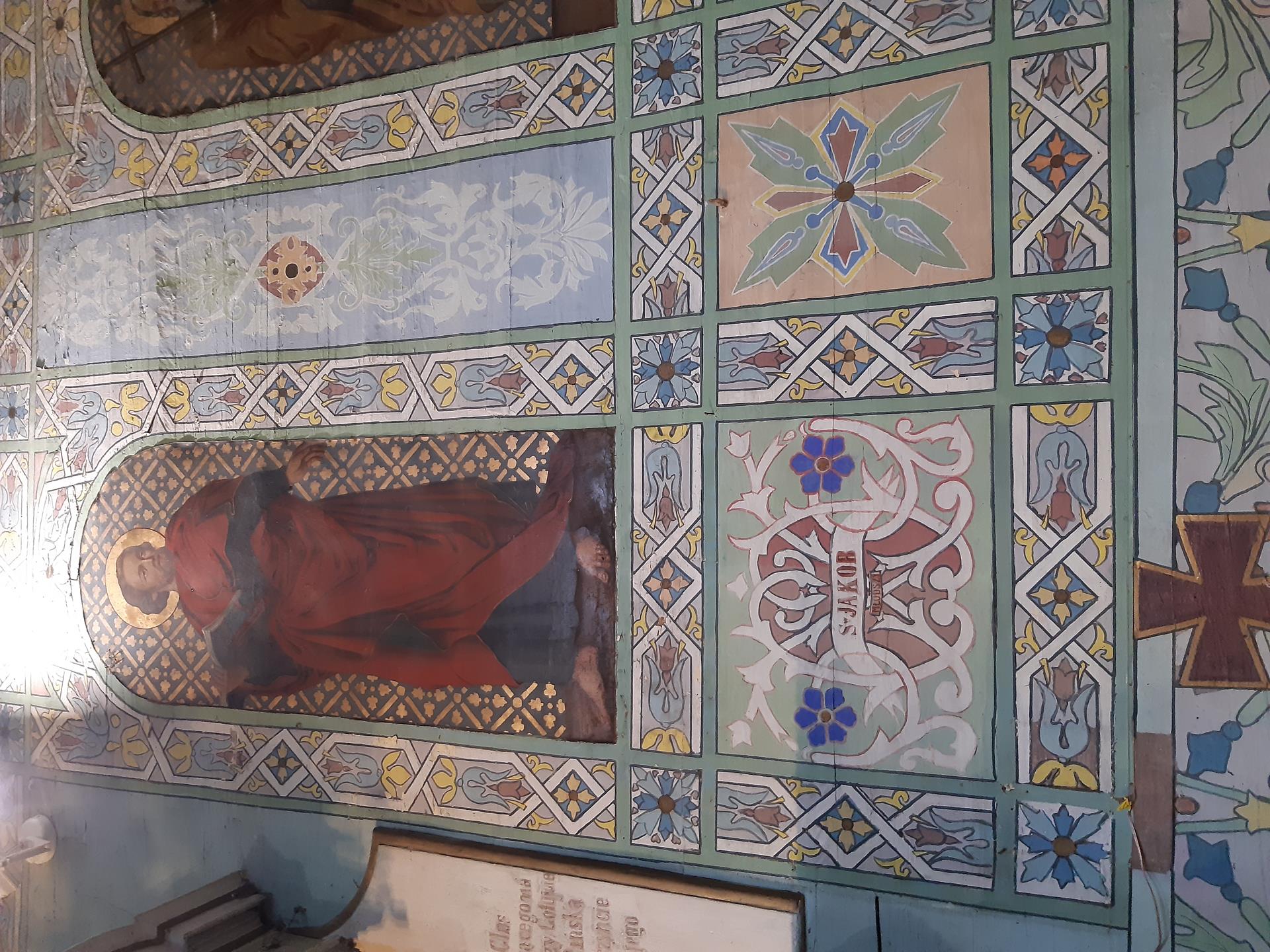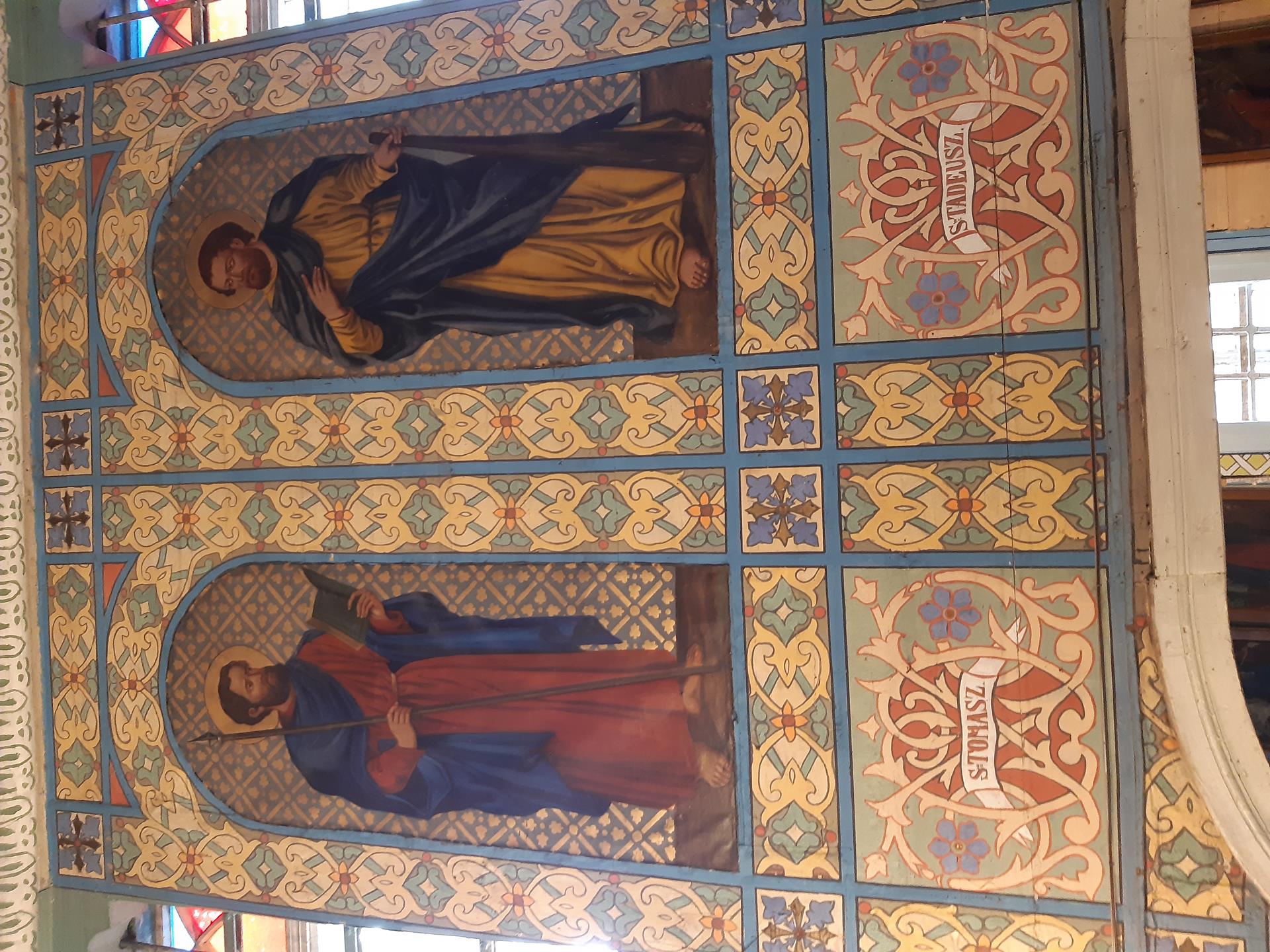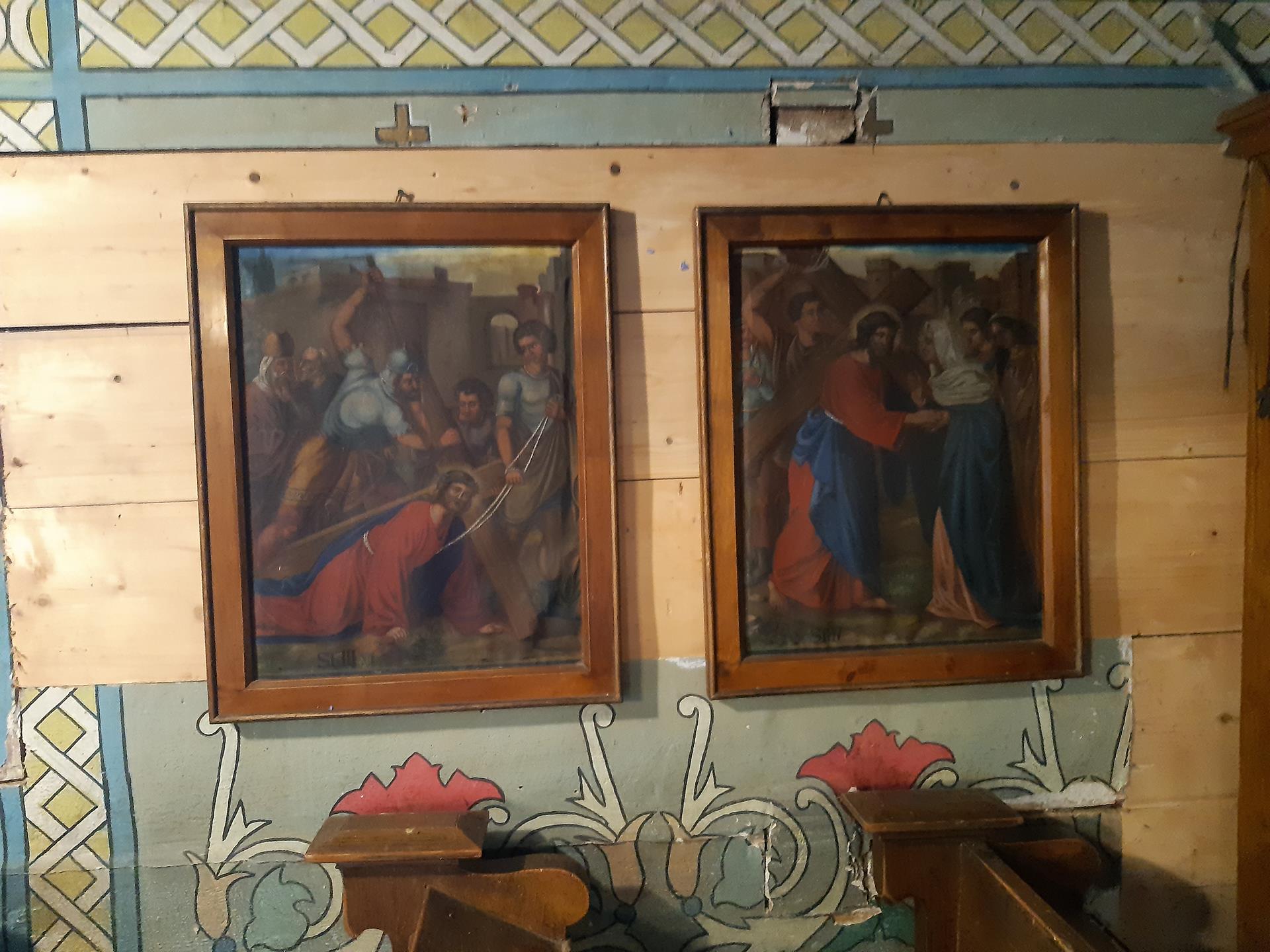 Ściany w kościele pomalowane są kolorowo, o przewadze jasnej zieleni, zdobione roślinnymi ornamentami. Kolorystyka polichromii oraz zdobienia posiadają naleciałości wschodniego stylu. Na ścianach widnieją olejne portrety, wykonane na płótnie, przedstawiające naturalnej wielkości dwunastu Apostołów. W prezbiterium od strony ołtarza, na ścianie północnej znajdują się obrazy świętych: Piotra, Jana, Filipa, Jakuba Młodszego, oraz symetrycznie na ścianie południowej świętych: Macieja, Jakuba Starszego, Mateusza i Andrzeja. Na ścianie północnej w nawie zostały umieszczone wizerunki świętych: Bartłomieja i Szymona, oraz symetrycznie na ścianie południowej nawy świętych: Tomasza i Tadeusza. Obrazy malował w 1883 r. malarz Stankiewicz z Oświęcimia, uczeń Jana Matejki. Było to drugie malowanie wnętrza kościoła. Pierwszego dokonano przed konsekracją świątyni, bo w 1777 r. Podczas prac konserwatorskich udało się odnaleźć i zabezpieczyć fragmenty oryginalnych malowideł naściennych, zdobiących prezbiterium. Można je zobaczyć za ołtarzem głównym oraz pod poziomem drewnianej podłogi w prezbiterium.