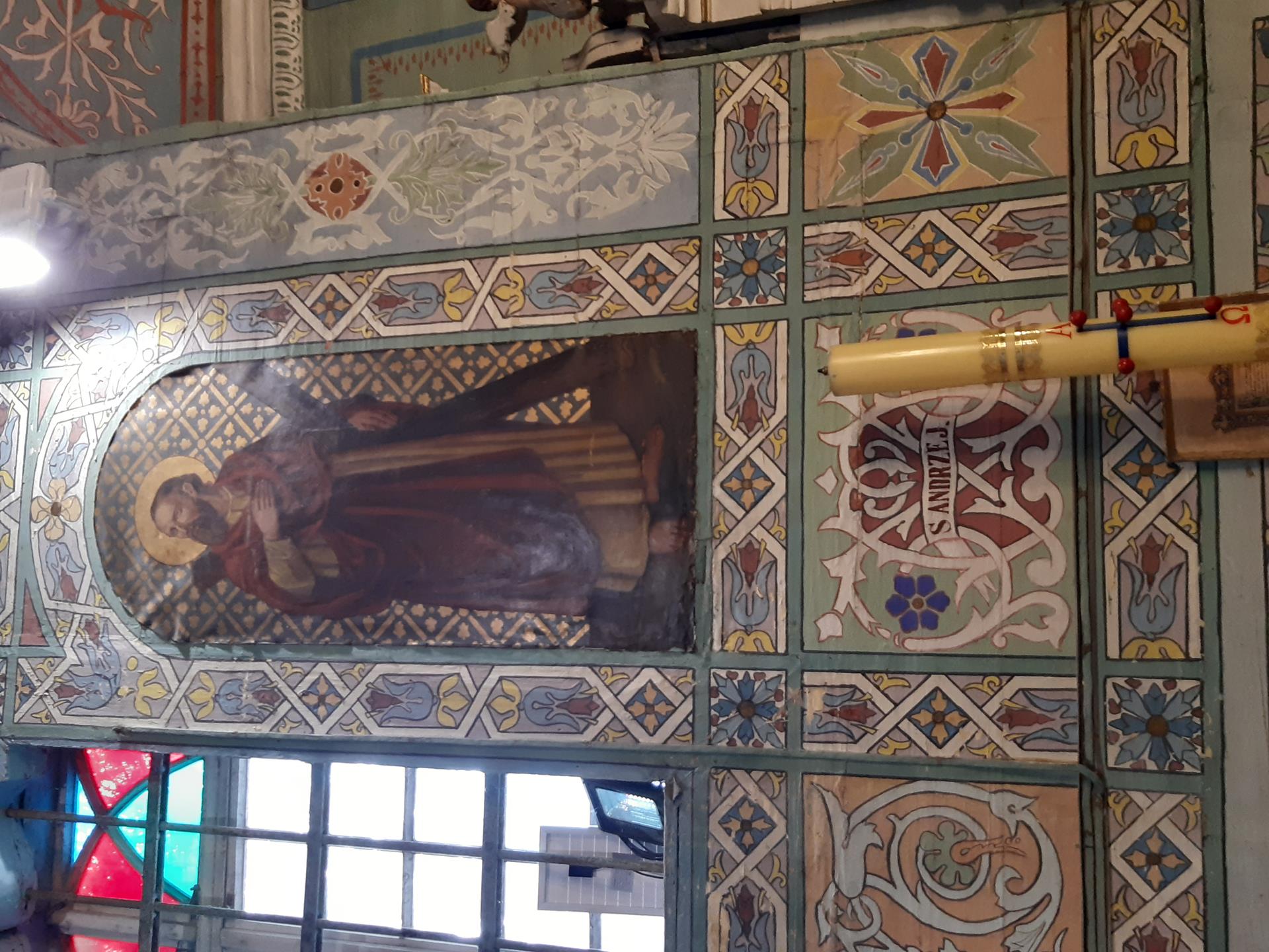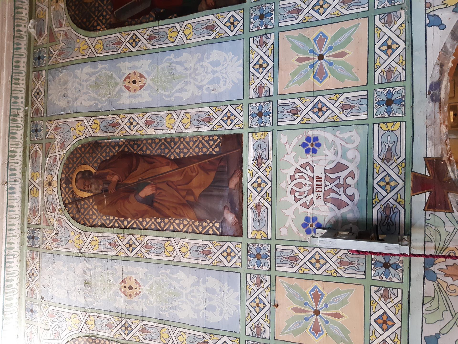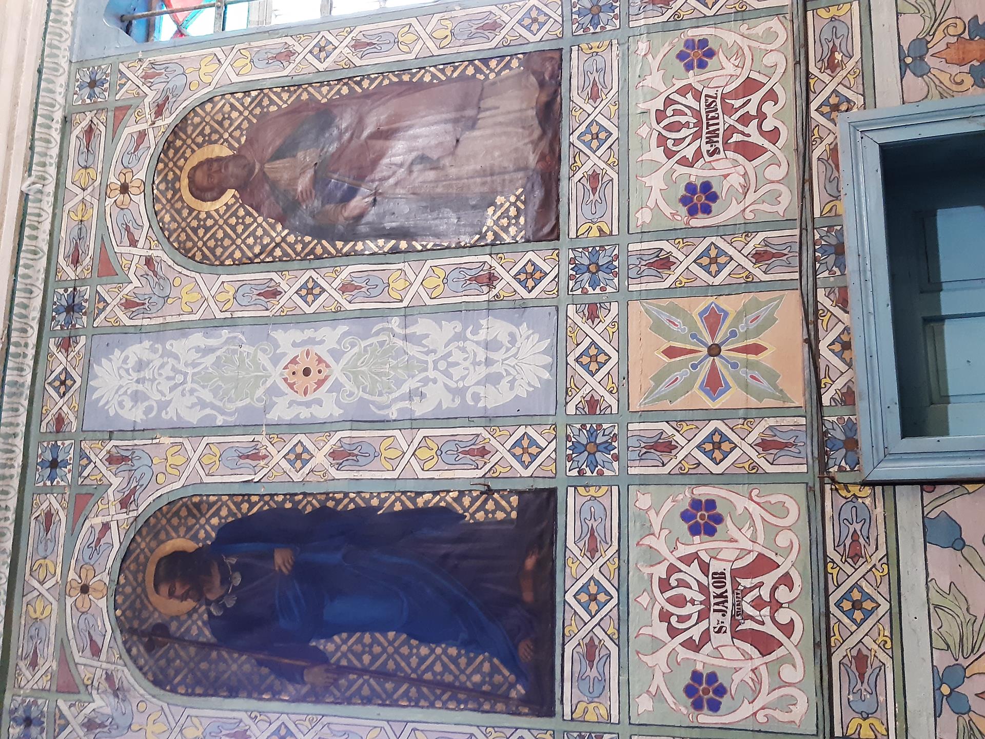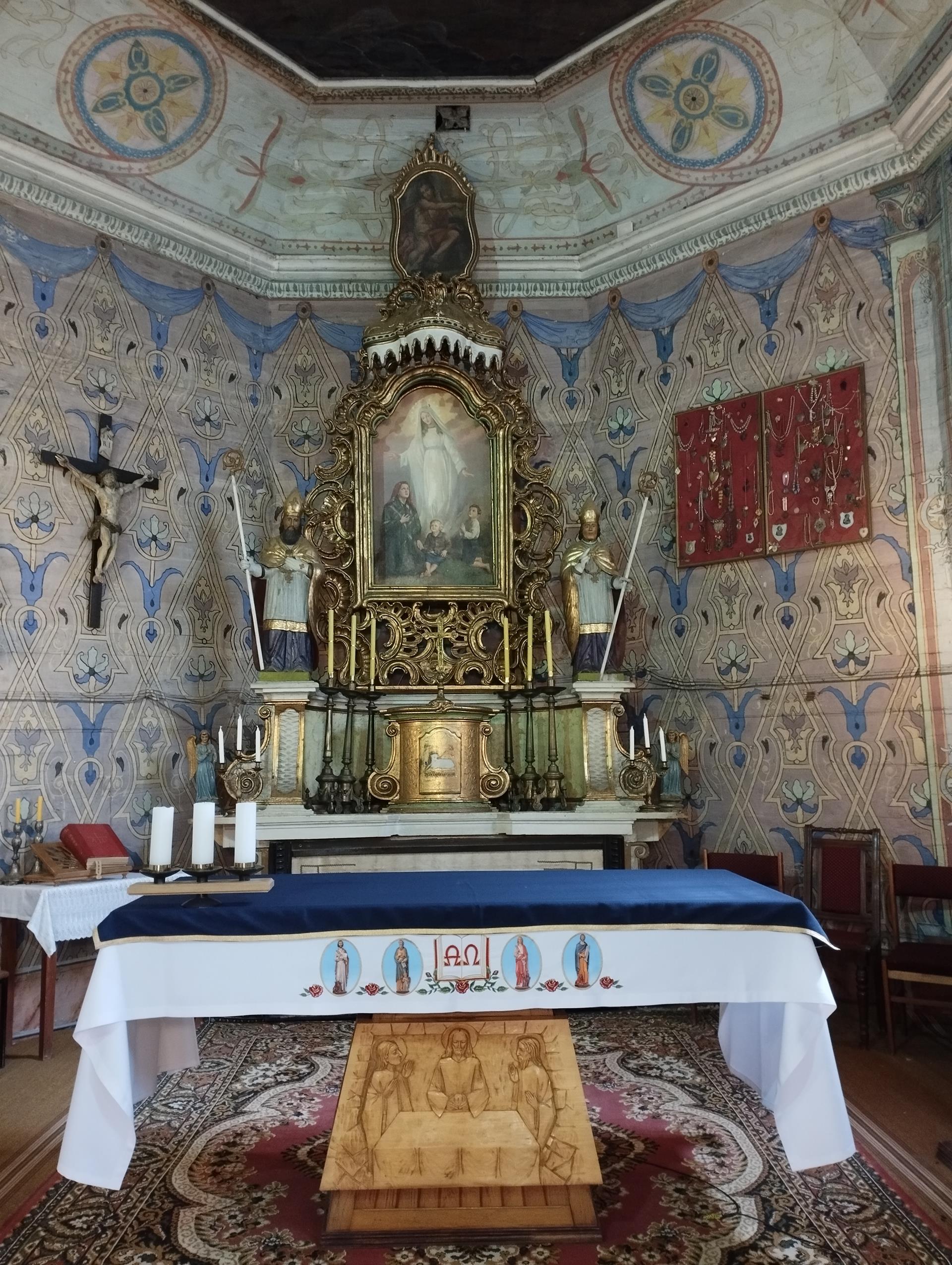 Ściany w kościele pomalowane są kolorowo, o przewadze jasnej zieleni, zdobione roślinnymi ornamentami. Kolorystyka polichromii oraz zdobienia posiadają naleciałości wschodniego stylu. Na ścianach widnieją olejne portrety, wykonane na płótnie, przedstawiające naturalnej wielkości dwunastu Apostołów. W prezbiterium od strony ołtarza, na ścianie północnej znajdują się obrazy świętych: Piotra, Jana, Filipa, Jakuba Młodszego, oraz symetrycznie na ścianie południowej świętych: Macieja, Jakuba Starszego, Mateusza i Andrzeja. Na ścianie północnej w nawie zostały umieszczone wizerunki świętych: Bartłomieja i Szymona, oraz symetrycznie na ścianie południowej nawy świętych: Tomasza i Tadeusza. Obrazy malował w 1883 r. malarz Stankiewicz z Oświęcimia, uczeń Jana Matejki. Było to drugie malowanie wnętrza kościoła. Pierwszego dokonano przed konsekracją świątyni, bo w 1777 r. Podczas prac konserwatorskich udało się odnaleźć i zabezpieczyć fragmenty oryginalnych malowideł naściennych, zdobiących prezbiterium. Można je zobaczyć za ołtarzem głównym oraz pod poziomem drewnianej podłogi w prezbiterium.