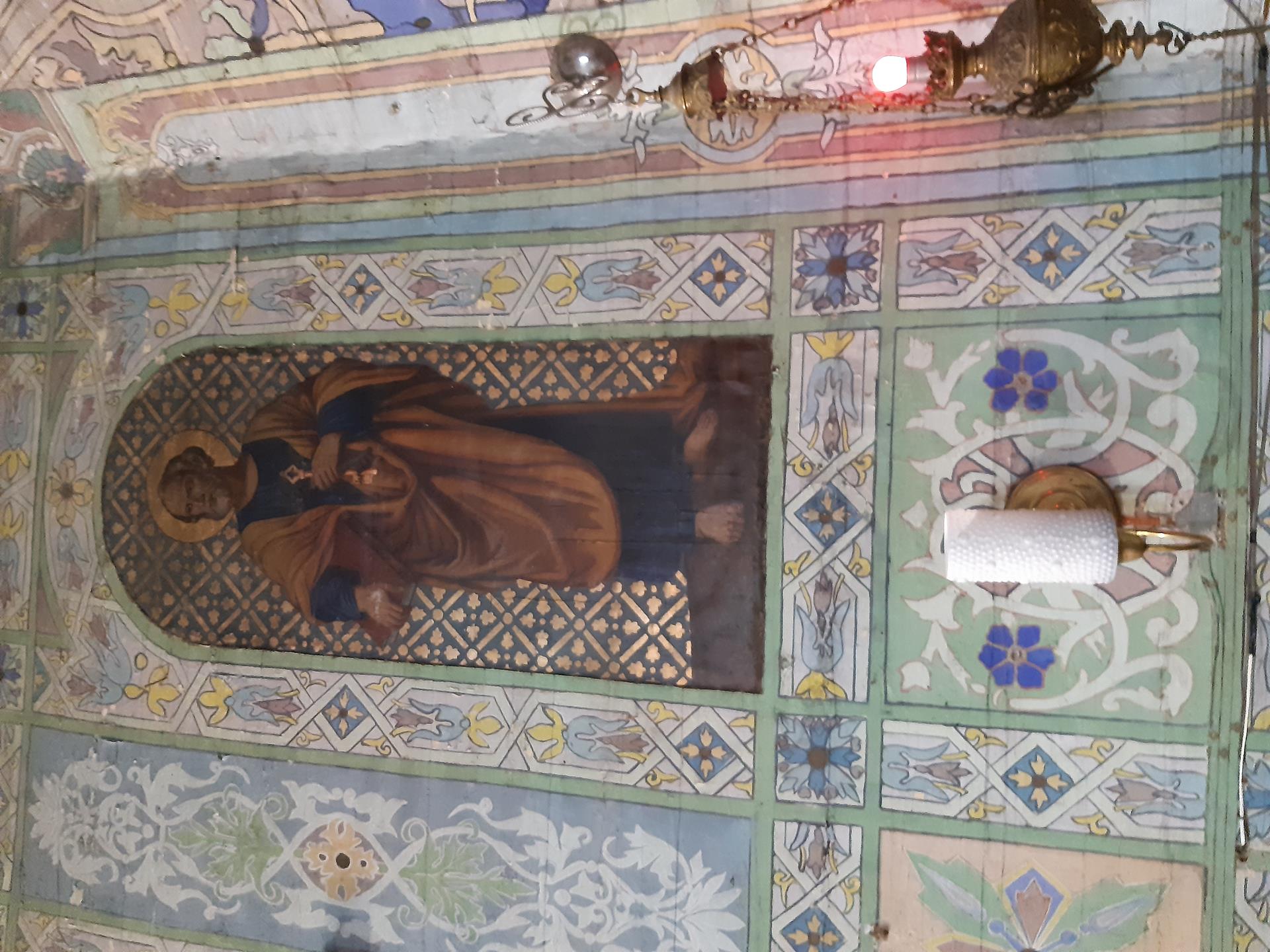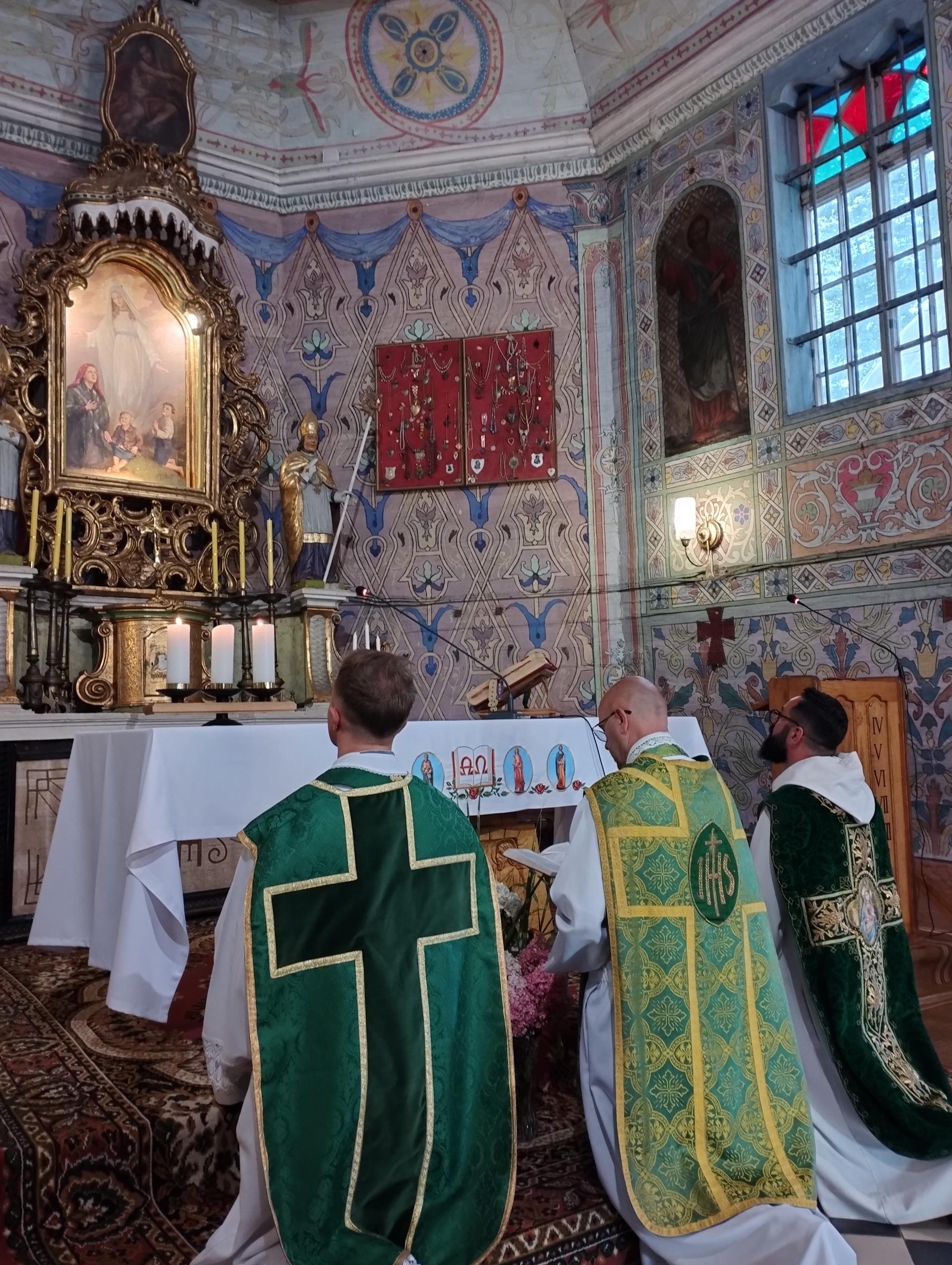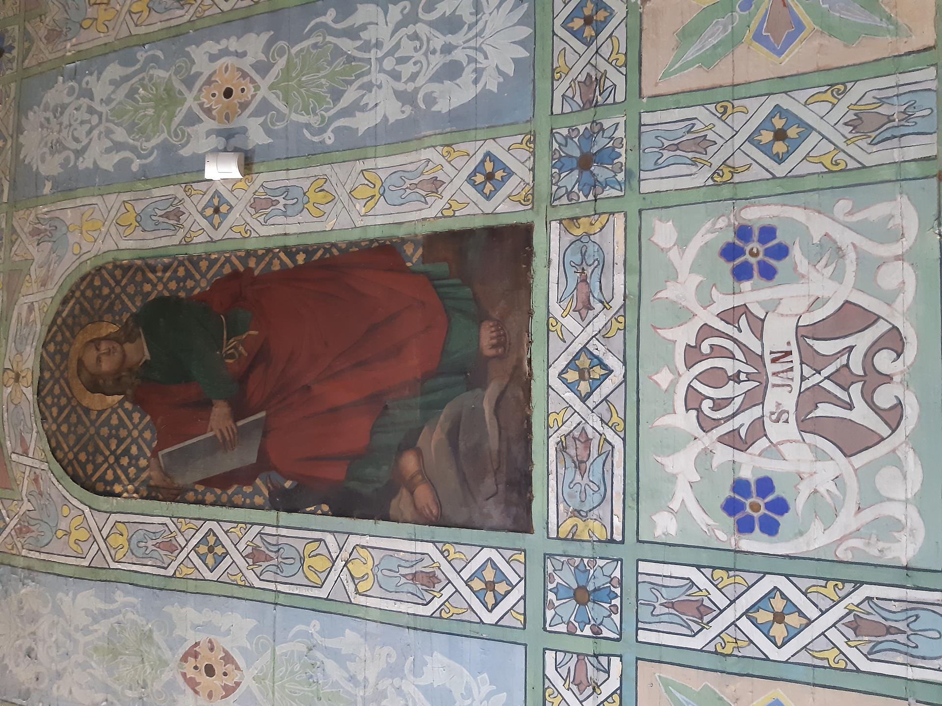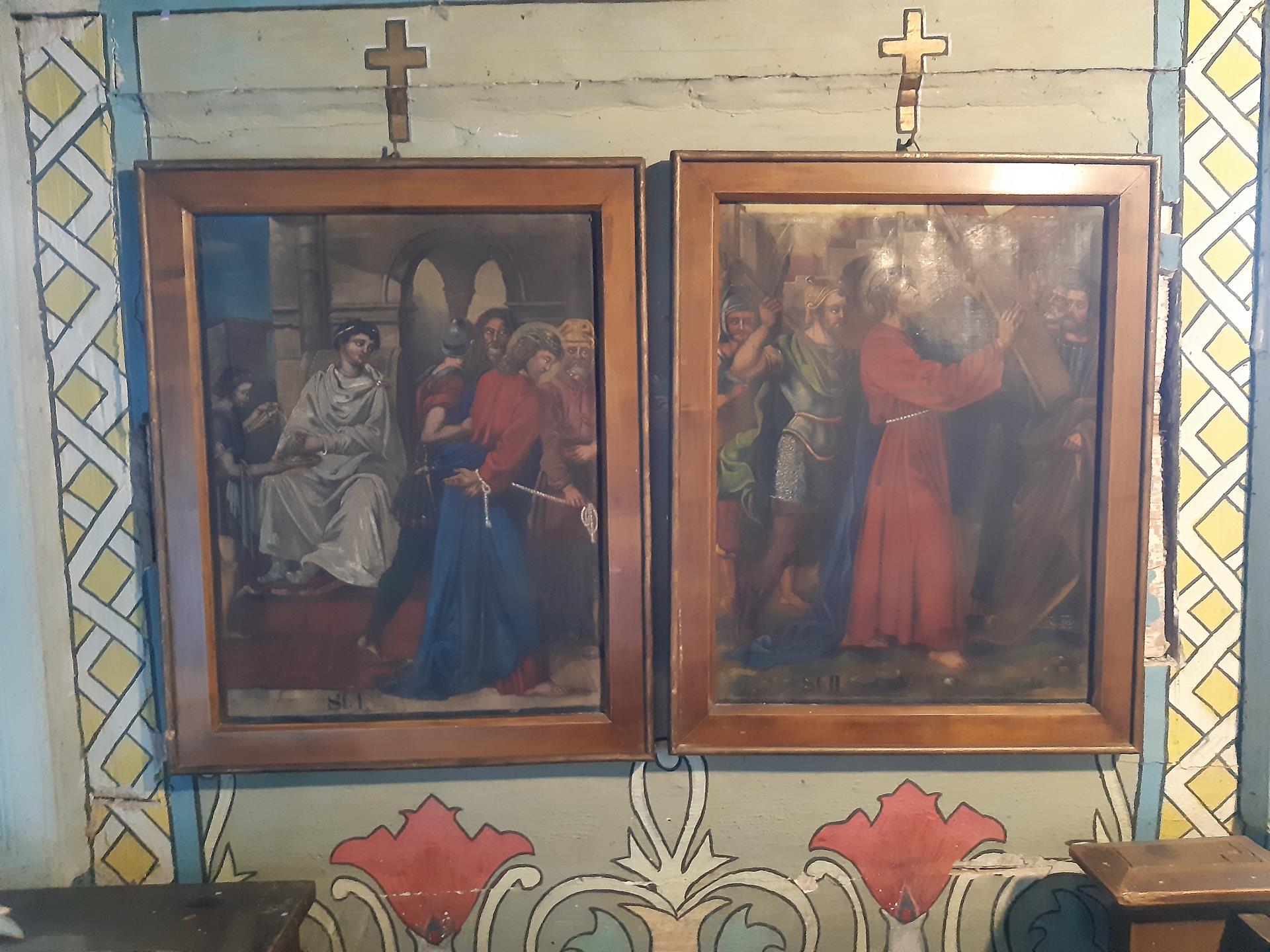 Ściany w kościele pomalowane są kolorowo, o przewadze jasnej zieleni, zdobione roślinnymi ornamentami. Kolorystyka polichromii oraz zdobienia posiadają naleciałości wschodniego stylu. Na ścianach widnieją olejne portrety, wykonane na płótnie, przedstawiające naturalnej wielkości dwunastu Apostołów. W prezbiterium od strony ołtarza, na ścianie północnej znajdują się obrazy świętych: Piotra, Jana, Filipa, Jakuba Młodszego, oraz symetrycznie na ścianie południowej świętych: Macieja, Jakuba Starszego, Mateusza i Andrzeja. Na ścianie północnej w nawie zostały umieszczone wizerunki świętych: Bartłomieja i Szymona, oraz symetrycznie na ścianie południowej nawy świętych: Tomasza i Tadeusza. Obrazy malował w 1883 r. malarz Stankiewicz z Oświęcimia, uczeń Jana Matejki. Było to drugie malowanie wnętrza kościoła. Pierwszego dokonano przed konsekracją świątyni, bo w 1777 r. Podczas prac konserwatorskich udało się odnaleźć i zabezpieczyć fragmenty oryginalnych malowideł naściennych, zdobiących prezbiterium. Można je zobaczyć za ołtarzem głównym oraz pod poziomem drewnianej podłogi w prezbiterium.