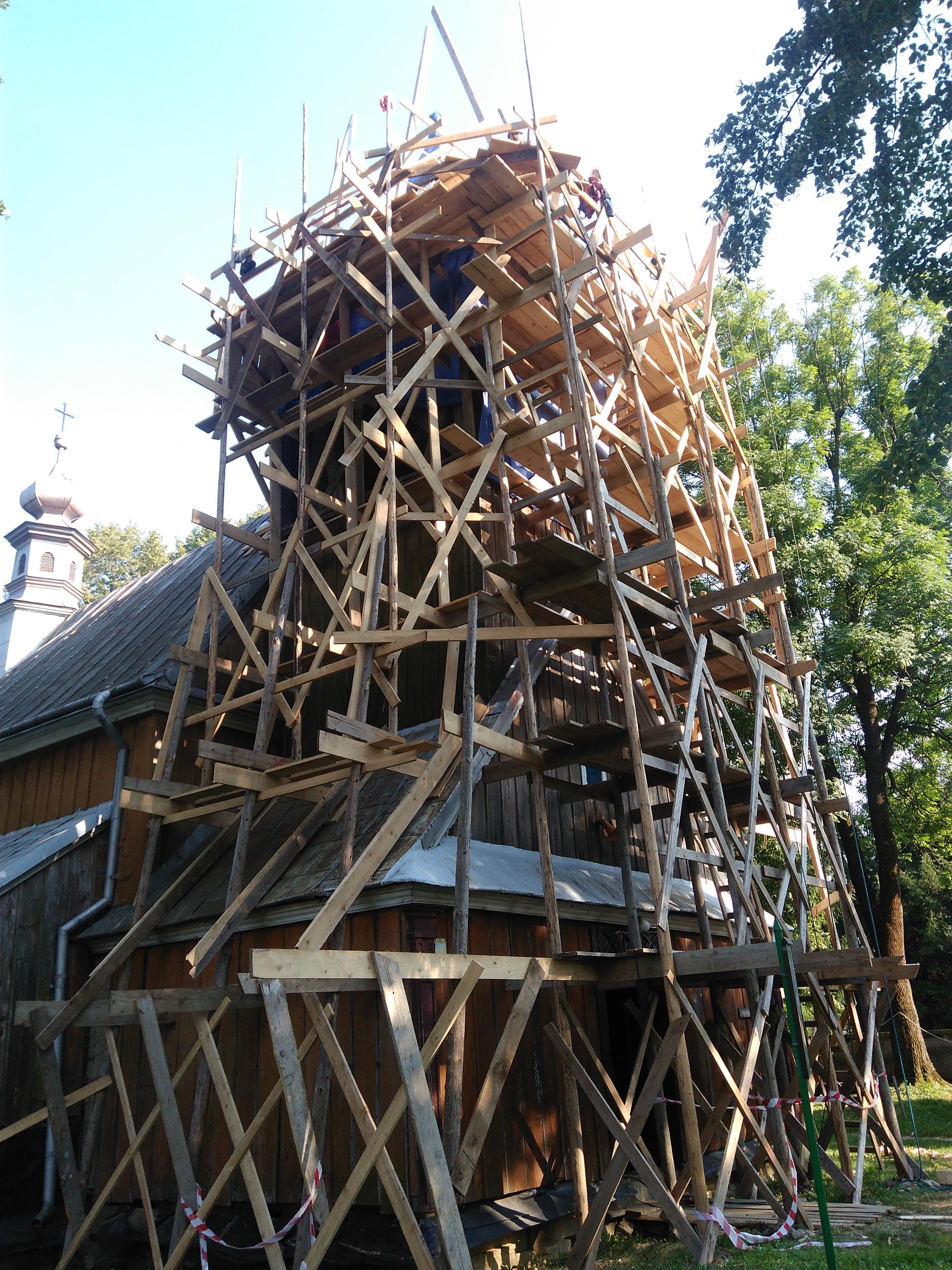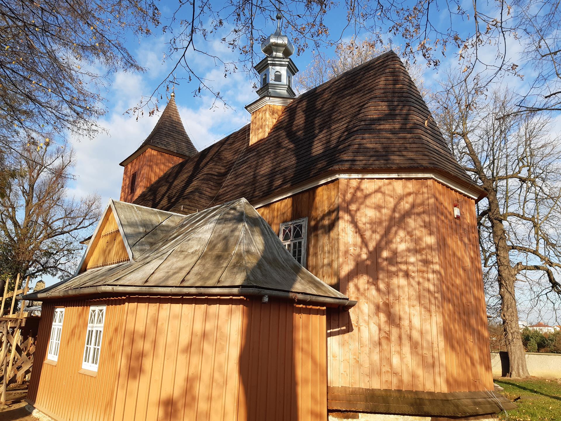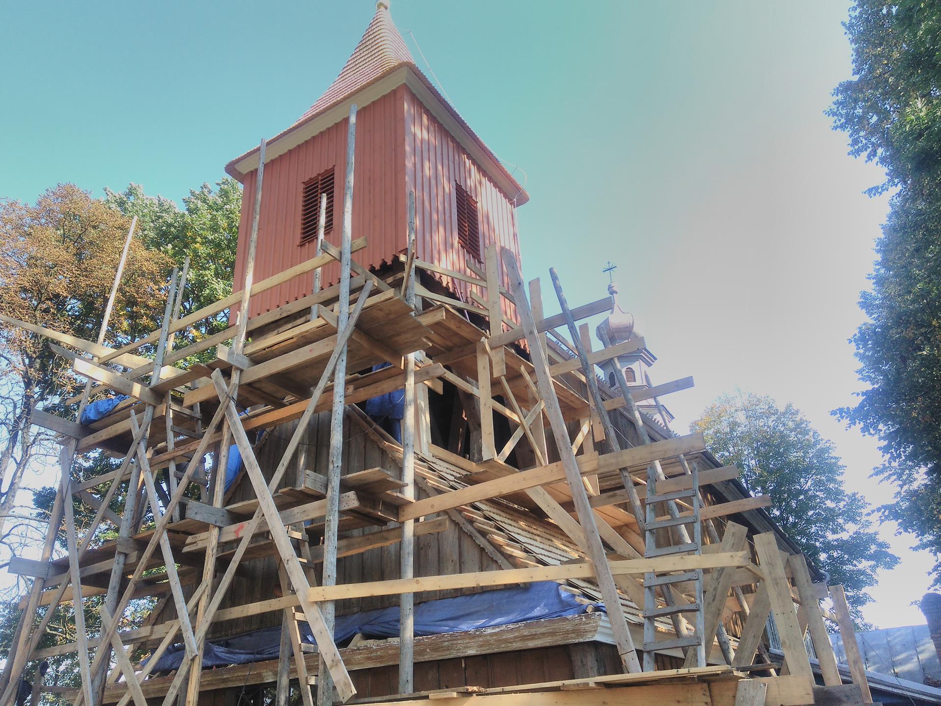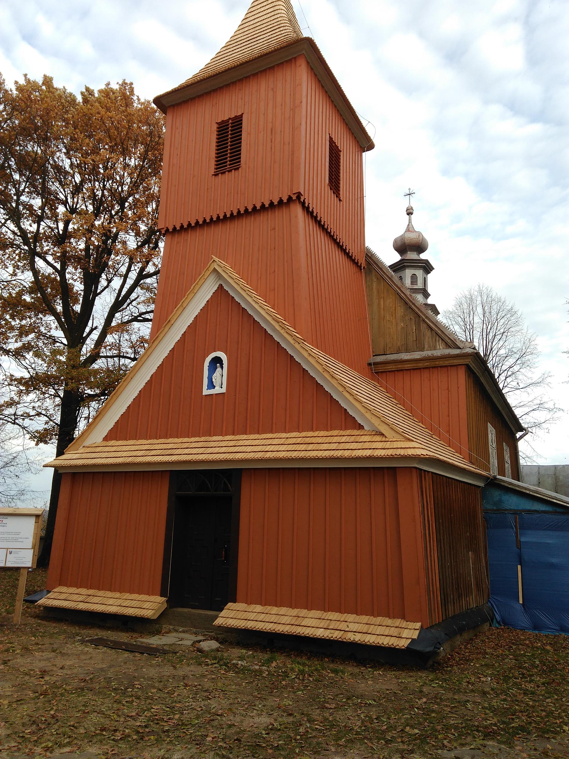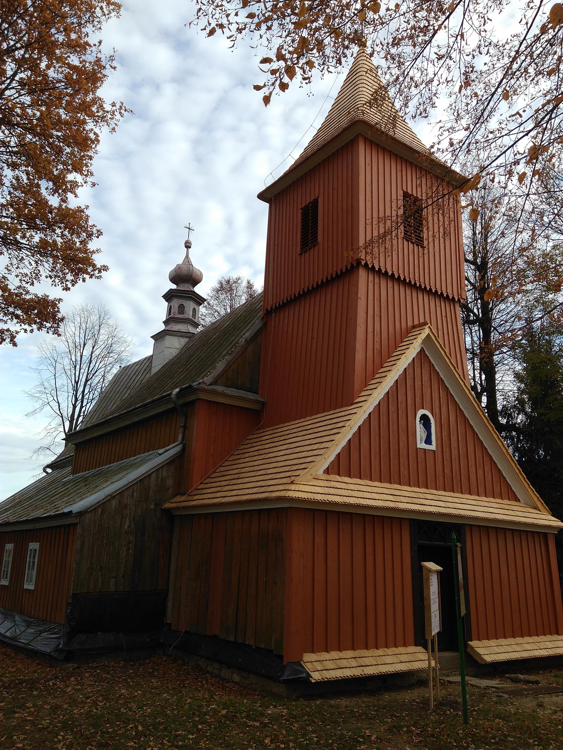 Z czasem drewniana wieża i dach wymagały reperacji. Przebudowy wieży dokonano w 1834 r., dachu w 1882 r. Ostatniej w omawianym okresie przebudowy dachu dokonano podczas I wojny światowej. Działo się to w specyficznych okolicznościach. Od 1905 r. zbierano fundusze wśród parafian tutejszych oraz zamieszkałych w Stanach Zjednoczonych na budowę nowego kościoła. Plany te były bardzo posunięte i powstanie nowej świątyni wydawało się być tylko kwestią czasu, jednak wybuch I wojny światowej i pogłębiający się kryzys gospodarczy spowodowały nagły wzrost inflacji i dewaluację pieniędzy. Obawiając się dalszego spadku wartości pieniędzy, zdecydowano się wykorzystać zgromadzone fundusze i w 1917 r. zakupiono blachę za sumę 4 tys. koron i pokryto nią kościół. W fasadzie kościoła, której nadano kształt prosty, umieszczono główne wejście, otwierane tylko w niedzielę i święta. Drugie drzwi, otwierane codziennie, znajdowały się u wejścia do kaplicy bocznej od południa. Portale były drewniane. Kościół oświetlały od strony południowej cztery okna w stylu gotyckim, zwieńczone lekkimi łukami.