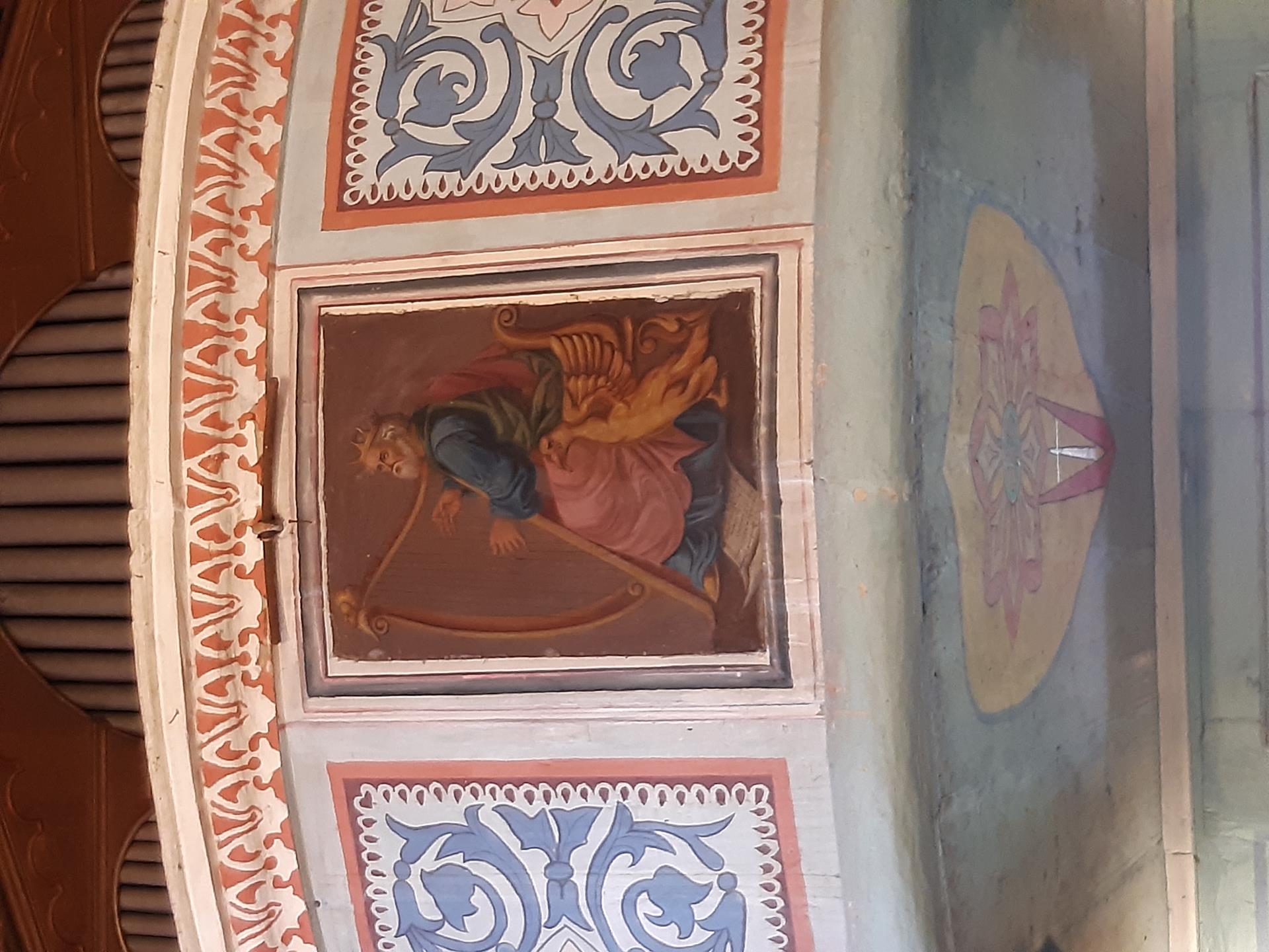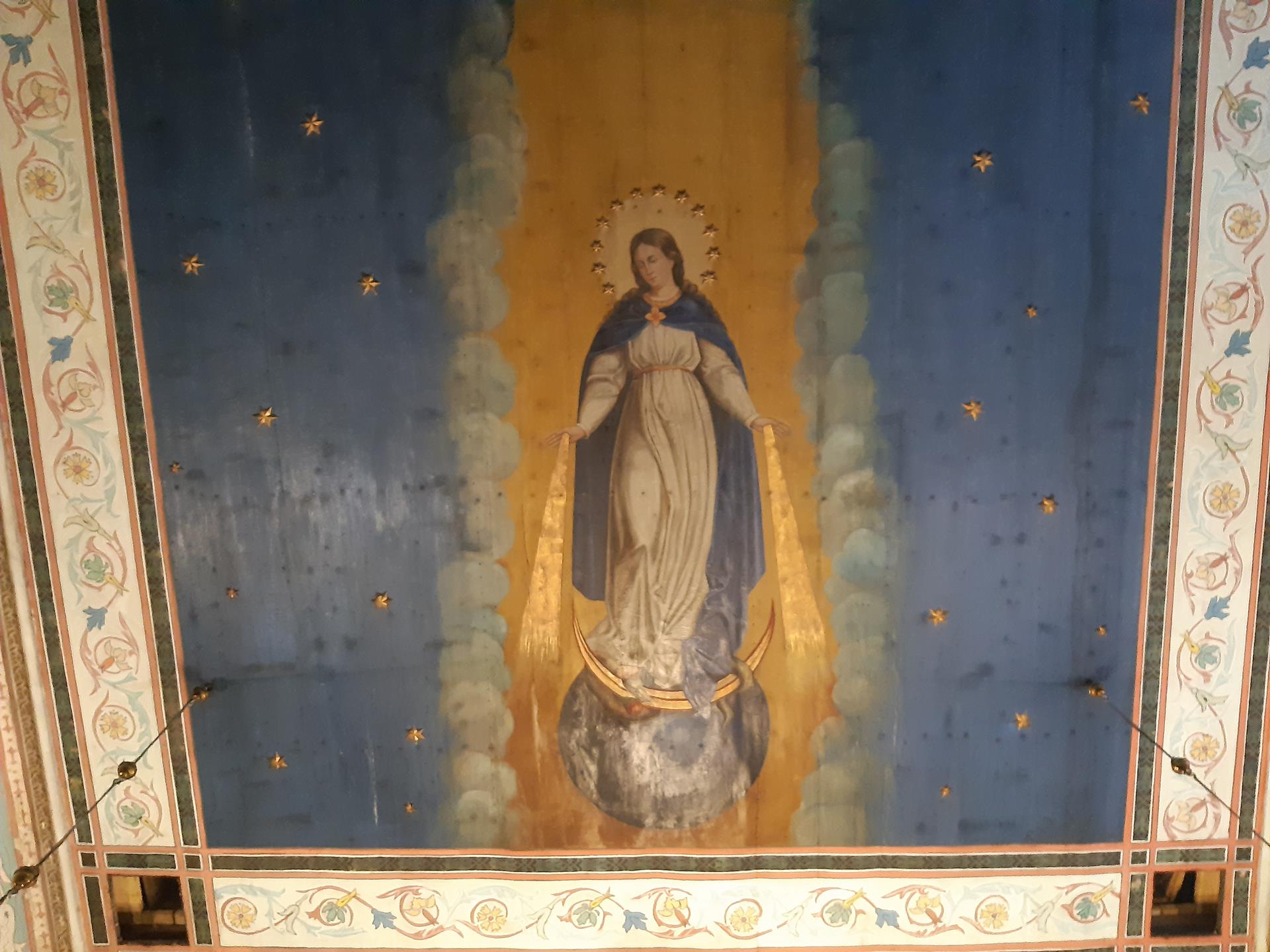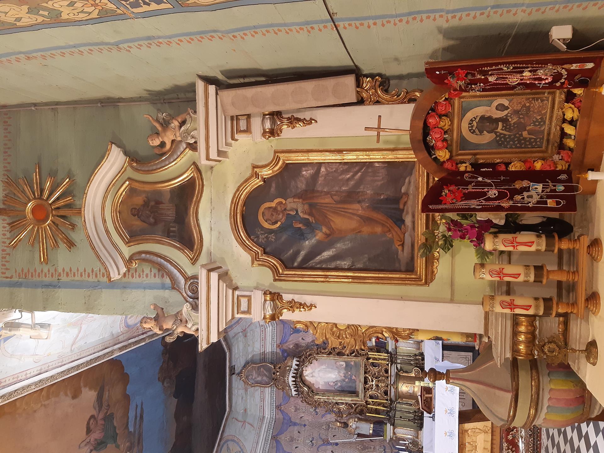 Na szczególną uwagę zasługuje pieknie zdobione wnętrze kościoła. Na suficie w prezbiterium widnieje obraz Wniebowstąpienia Pana Jezusa. Na orzechowym tle wznosi się postać Chrystusa z rozwartymi ramionami, na ziemi pochyleni lub klęczący apostołowie wpatrują się w niebo. W nawie sufit zdobi obraz Najświętszej Maryi Panny Niepokalanie Poczętej. Na błękitnym tle, w otoczeniu gwiazd, Maryja z księżycem pod Jej stopami. Poniżej księżyca widnieje kula ziemska.