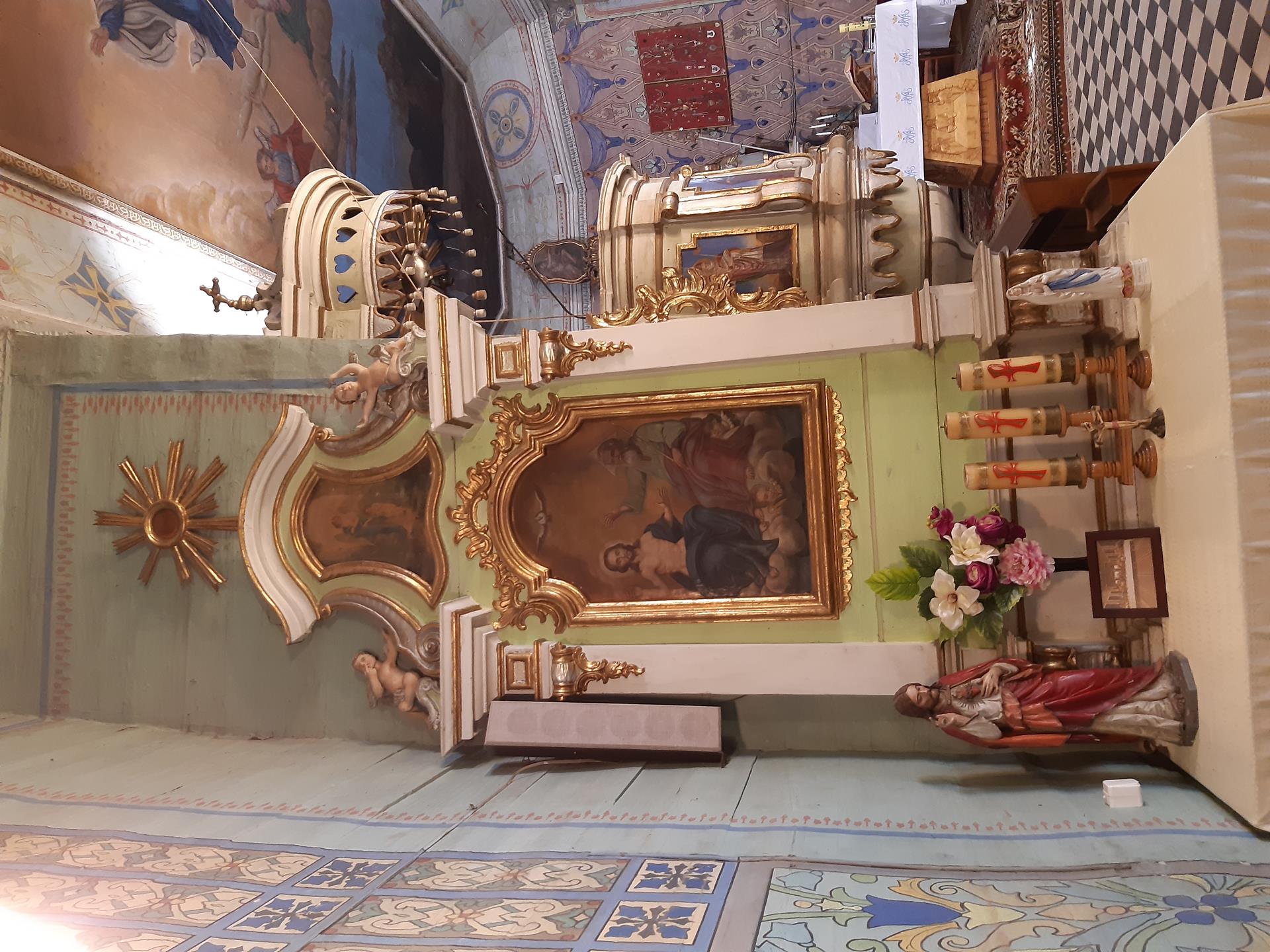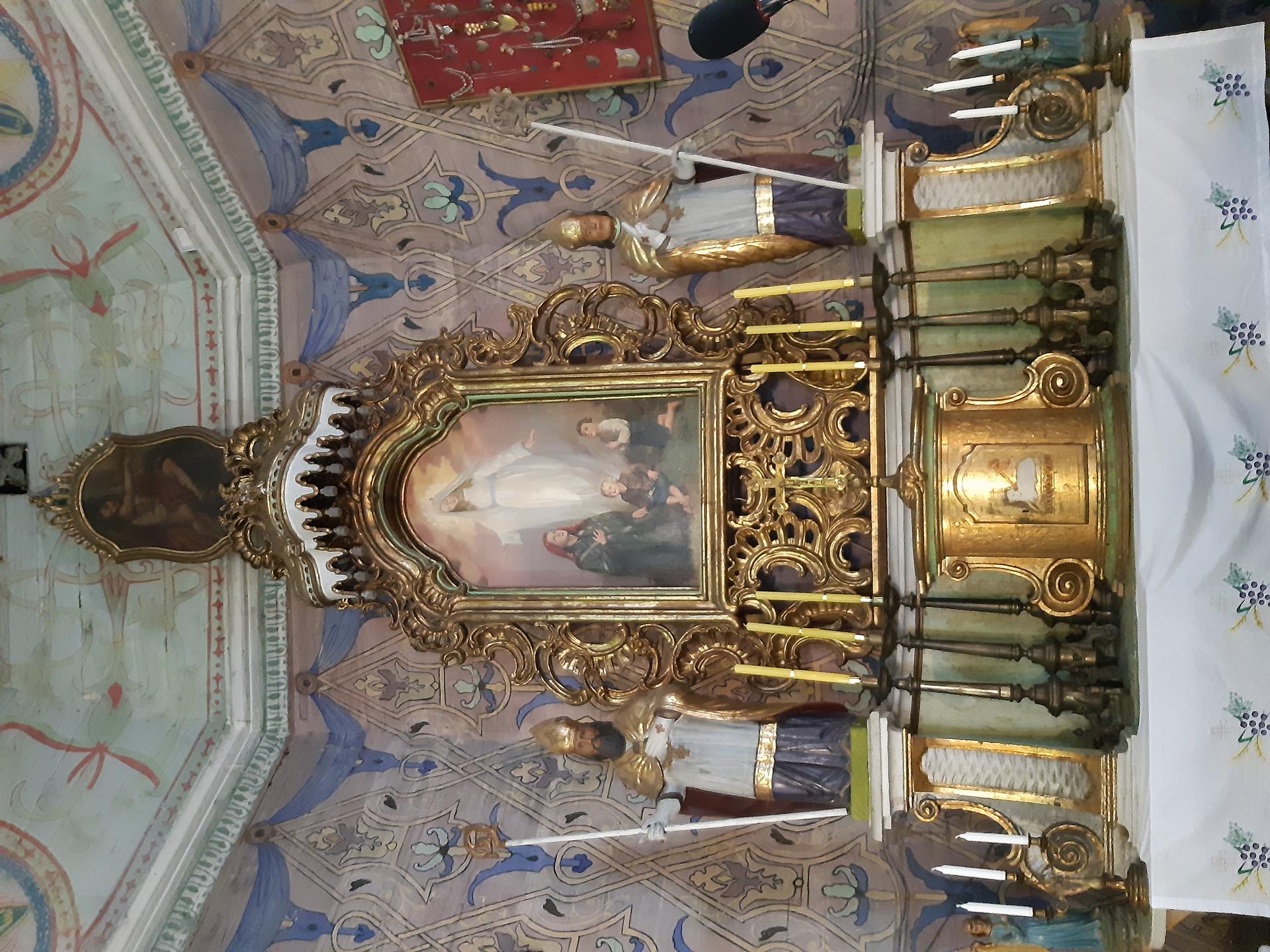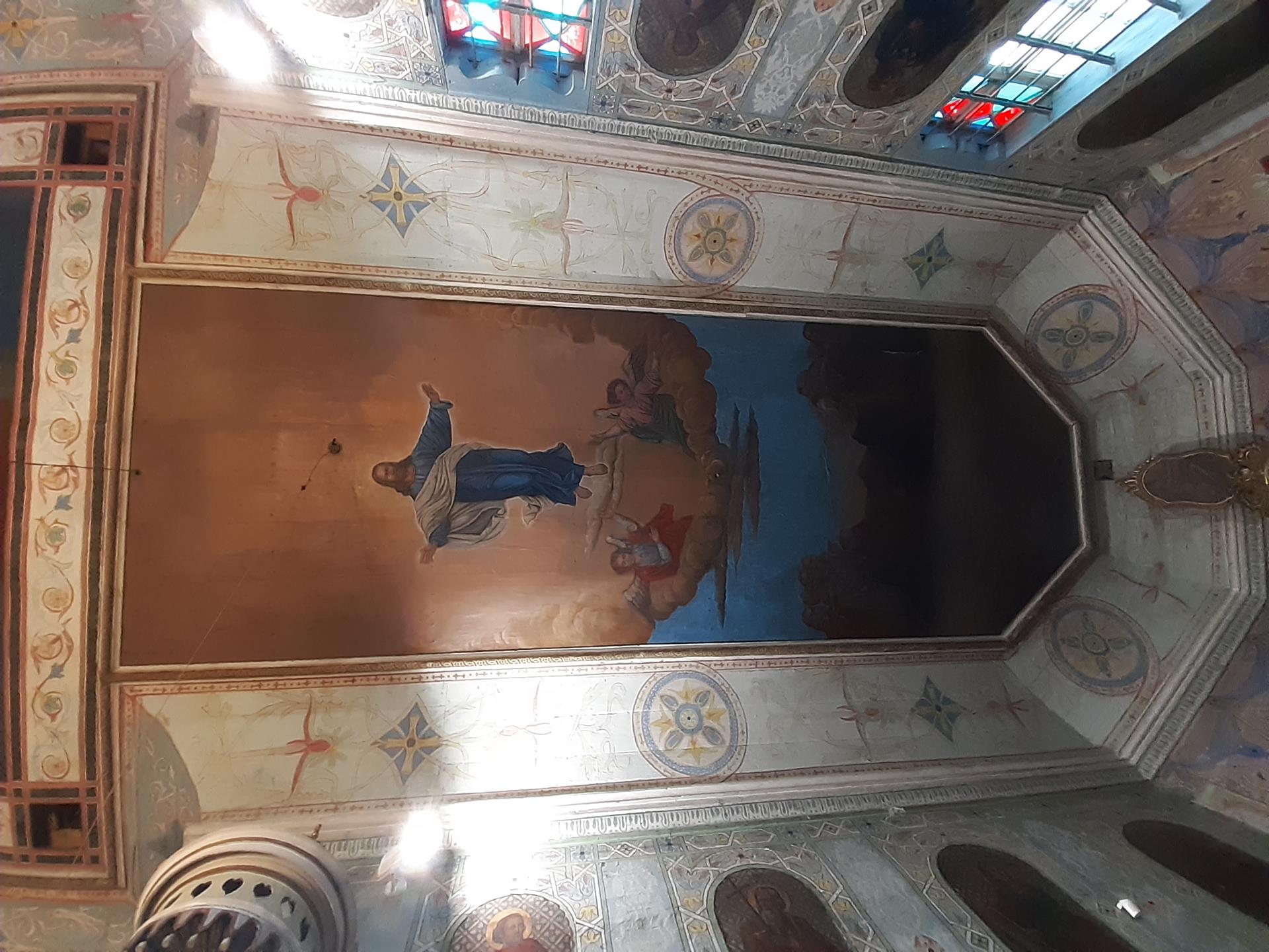 Na szczególną uwagę zasługuje pieknie zdobione wnętrze kościoła. Na suficie w prezbiterium widnieje obraz Wniebowstąpienia Pana Jezusa. Na orzechowym tle wznosi się postać Chrystusa z rozwartymi ramionami, na ziemi pochyleni lub klęczący apostołowie wpatrują się w niebo. W nawie sufit zdobi obraz Najświętszej Maryi Panny Niepokalanie Poczętej. Na błękitnym tle, w otoczeniu gwiazd, Maryja z księżycem pod Jej stopami. Poniżej księżyca widnieje kula ziemska.