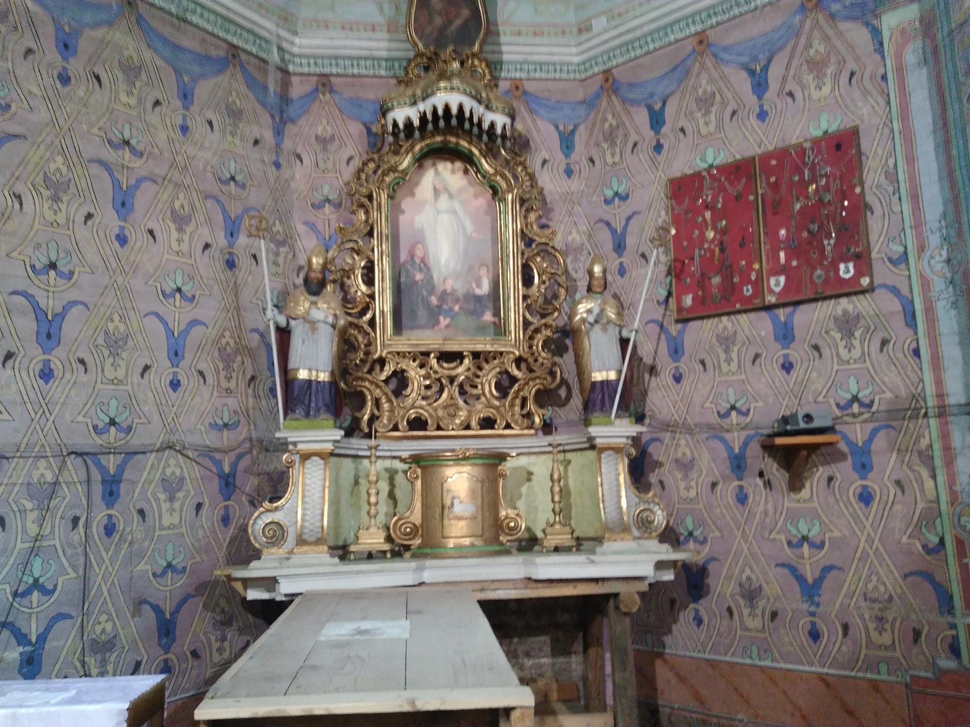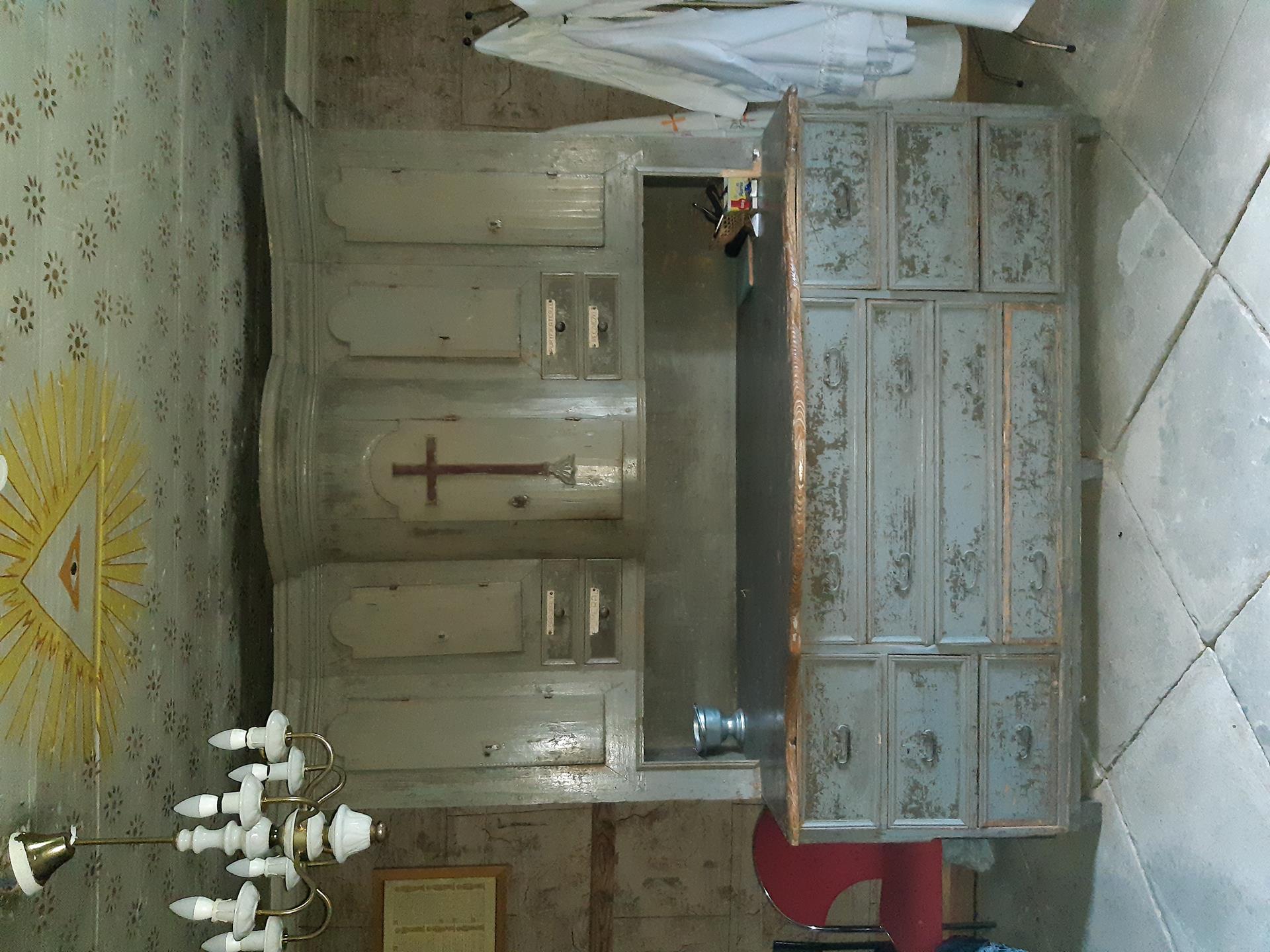 Dwie pary symetrycznie ułożonych, mniejszych okien znajdowały się w kaplicach bocznych. Do 1883 r. istniało też okno w ścianie nawy, od strony północnej. Od północy do prezbiterium przylega mała zakrystia. Znajduje się w niej zabytkowa, bogato zdobiona kredensja, przeznaczona do przechowywania szat liturgicznych i paramentów używanych podczas nabożeństw. W drewnianych szafach znajdują się bogato zdobione kapy, stuły i ornaty skrzypcowe, do dziś używane podczas celebracji. Niestety nie wiadomo, co stało się z wieloma szatami, które zniknęły na przełomie lat 80/90 ubiegłego stulecia. W szafach znajduje się wiele ksiąg liturgicznych, na uwagę zasługują bogato zdobione Mszały i ręcznie przepisywany Ewangeliarz. Kielichy i naczynia liturgiczne są w miarę możliwości odnawiane i wykorzystywane podczas odprawianych w sezonie letnim Mszy. Nad zakrystią znajduje się zamaskowane pomieszczenie zwane skarbcem, pełniące rolę strychu. Przechowywano tam paramenty liturgiczne rzadziej wykorzystywane oraz sezonowe elementy dekoracji. Na wyposażeniu zakrystii znajdują się liczne księgi i tablice ołtarzowe, które wyszły z użycia po wprowadzeniu soborowych reform liturgii.