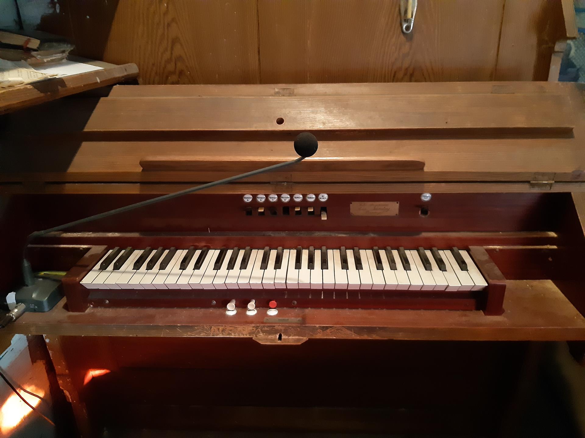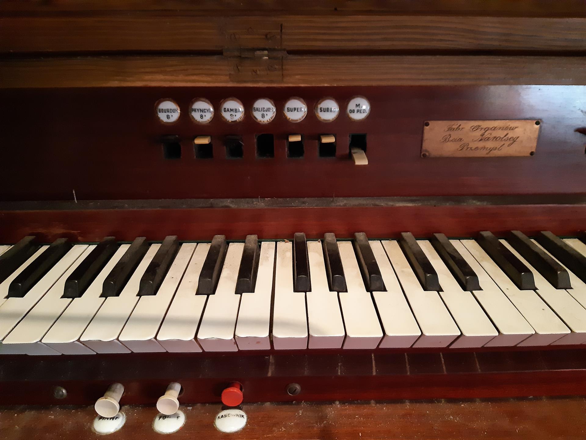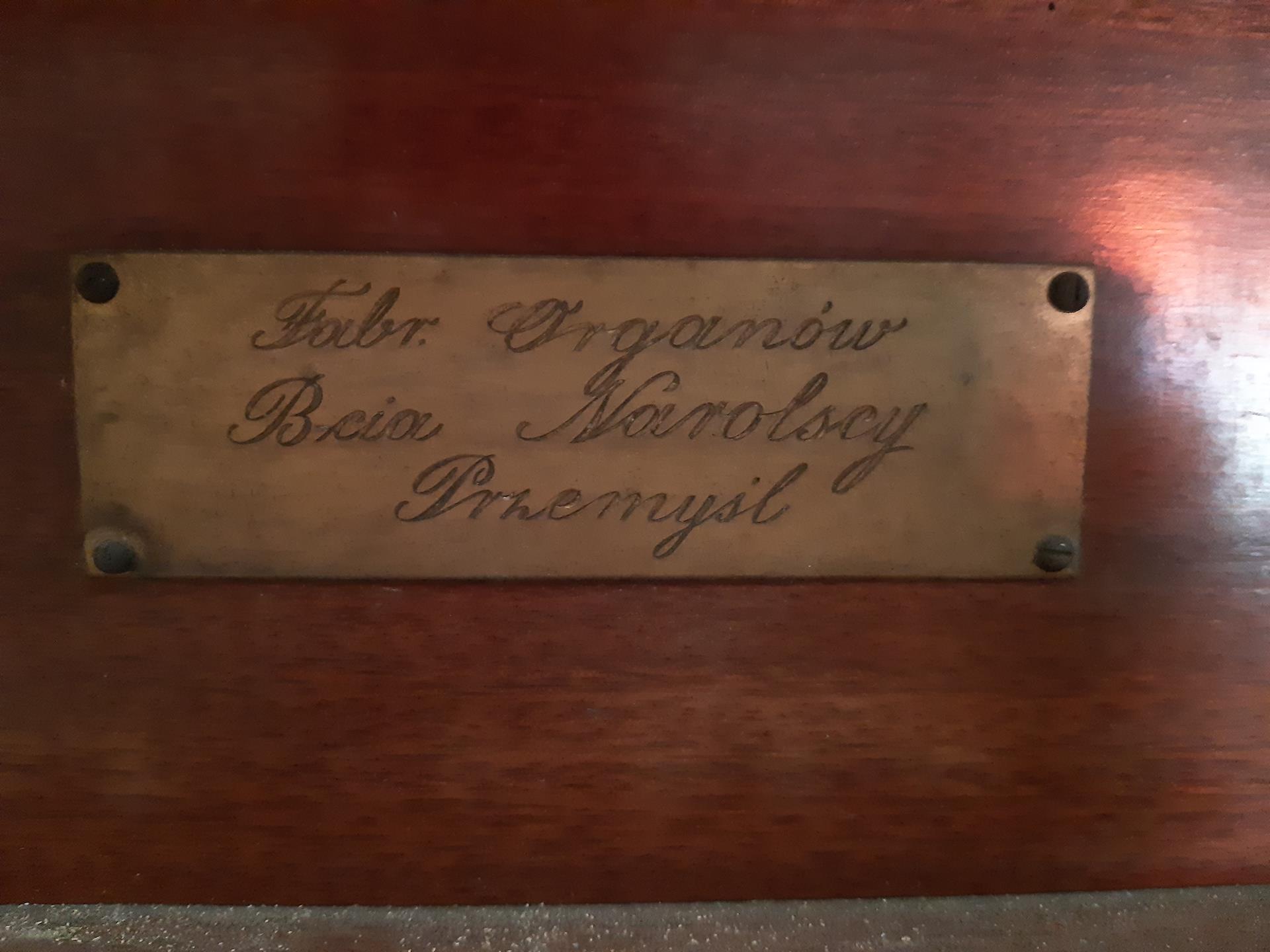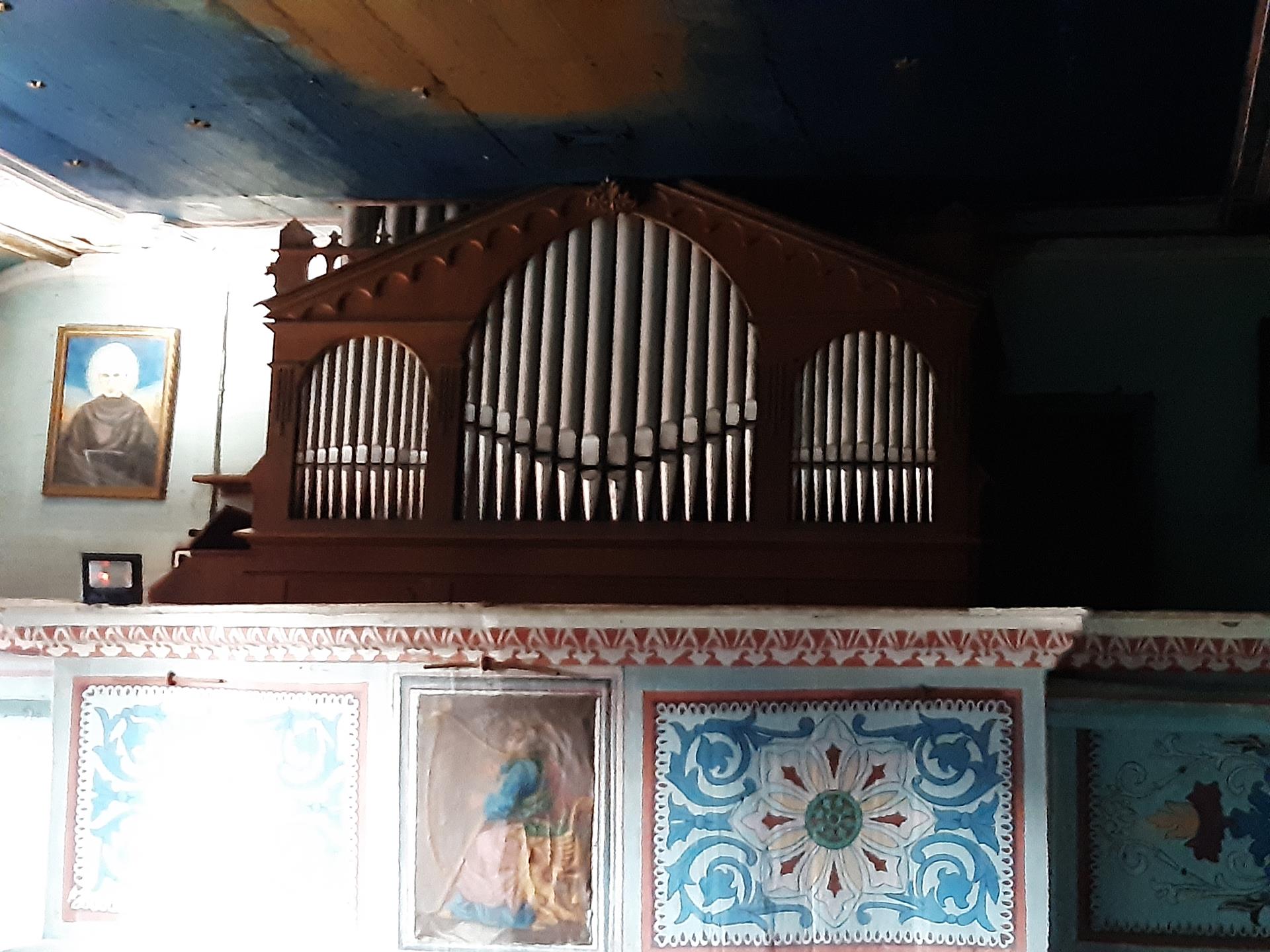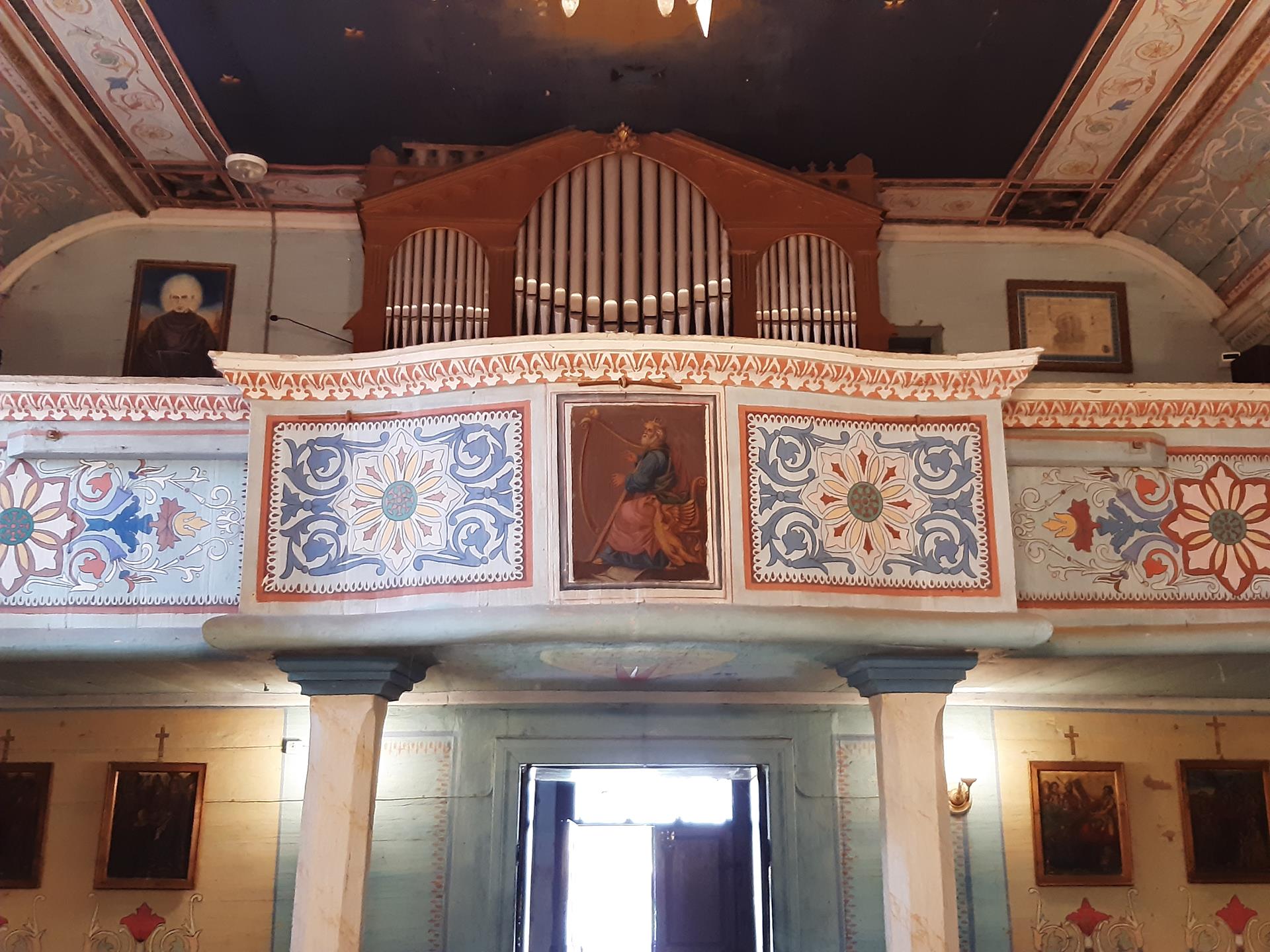 W zakończeniu nawy od strony zachodniej, wsparty na dwóch drewnianych filarach, mieści się chór muzyczny, na którym na początku XIX w. wybudowano organy. Emporę, wspartą na dwóch filarach, zdobią obrazy św. Stanisława Kostki oraz św. Kazimierza Królewicza, a centralnie nad wejściem wizerunek króla Dawida grającego na harfie. Po kilkudziesięciu latach używania, organy zaczęły się psuć. Ich remont przeprowadzono w pierwszej połowie lat osiemdziesiątych XIX w. Po kolejnych kilkudziesięciu latach nie nadawały się już nawet do remontu, więc w 1938 r. rozebrano je całkowicie (elementy konstrukcyjne oraz fragmenty wiatrownic zachowały się). W tymże roku firma Narolskich zbudowała nowe. Obecne organy, to 4 głosowy instrument o pneumatycznej trakturze gry, z miechem i dmuchawą elektryczną umiejscowioną wewnątrz wieży. Organy dysponują w manuale głosami: Burdon 8’, Salicjonal 8’ (nieczynny – w rzeczywistości 4’), Gamba 8’, Pryncypał 8’ - częściowo grający w prospekcie. Sekcja pedału nie ma własnych rejestrów – najniższa oktawa posiada własne piszczałki głosu Burdon (16’), dalej jest transmisją tego głosu z mauału. Dla wzmocnienia brzmienia instrumentu zastosowano połączenia super, subbo oraz man-pedał. Instrument wyposażony jest w dwie kombinacje piano i forte oraz tremollo. Stan instrumentu wymaga gruntownego remontu.